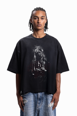 SACRED HEART BOXY DISTRESSED BLACK WASHED T-SHIRT