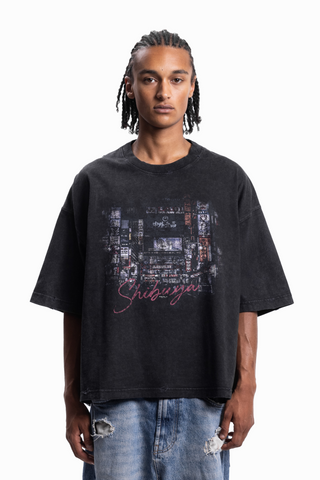 SHIBUYA BOXY DISTRESSED BLACK WASHED T-SHIRT