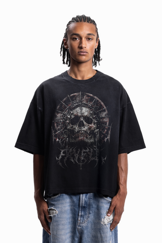 TRIBAL SKULL BOXY DISTRESSED BLACK WASHED T-SHIRT